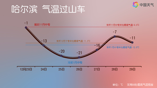 在即将出现明显降温的区域中,东北地区气温震荡最为剧烈,降温过后气温偏低幅度也更大。以哈尔滨为例,常月下旬平均最高气温为-11.3℃,今天最高气温可达-1℃;明天起三天内气温将持续下降,最高气温将迎来今冬首次跌破-20℃。这意味着当地将从常年同期少见的温暖,迅速转为较常年同期大幅偏冷,气温波动极为剧烈。